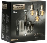 Максимальная мощность 1000 Вт Погружная часть и лезвия из нержавеющей стали Корпус из пластика, декорирован нержавеющей сталью Плавная регулировка скорости 5 скоростей Турборежим Скорость вращения: 15000 об/мин 20% Насадка венчик для взбивания Стакан для смешивания 700 мл Насадка блендер для измельчения и смешивания Насадка измельчитель объёмом 500 мл Насадка для приготовления пюре Длина шнура 1,2 м Электропитание 220 240 В, 50 60 Гц