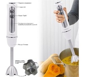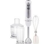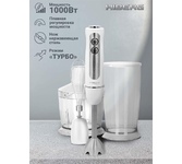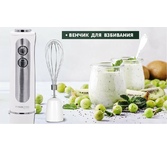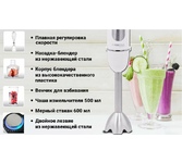 Мощность 1000 Вт, 5 скоростей, Плавная регулировка скорости, Венчик для взбивания, Измельчитель 500 мл, Мерный стакан 600 мл, Лезвие из нержавеющей стали, Турборежим. Цвет белый