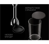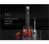 3 в 1 Мощность 1200Вт Емкость измельчителя 0,65л. Емкость стакана – 0,8л. Корпус – пластик, нерж.сталь Покрытие Soft Touch Плавная регулировка скоростей. Нож из нержавеющей стали Удобная конструкция шнура питания. LED подсветка
