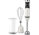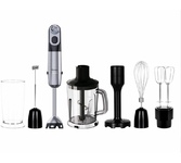 Мультифункциональный блендерный набор для измельчения, смешивания, шинковки и нарезки кубиками Мощность 1500 Вт Лезвия из титана Погружная часть блендера с нейлоновым покрытием для предотвращения повреждения посуды Корпус из пластика, декорирован нержавеющей сталью Плавная регулировка скорости Насадка-измельчитель объёмом 1,5 литра Диск для терки Диск для шинковки Насадка для нарезки продуктов кубиками S-образный нож из нержавеющей стали Толкатель для чистки диска Насадка-венчик для взбивания Стакан для смешивания 800 мл Насадка-блендер для измельчения и смешивания Капучинатор Электропитание 220-240 В, ~50-60 Гц