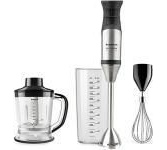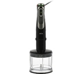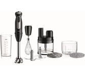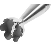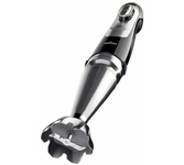 Мощность 750Вт. 12 режимов скорости и дополнительная кнопка «Турборежим» для максимальной мощности. Ножка блендера из нерж. стали с 4 острыми лезвиями ножа QuattroBlade. В комплекте: измельчитель д/зелени, орехов и сыра, венчик д/взбивания яичных белков..