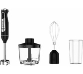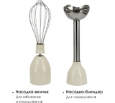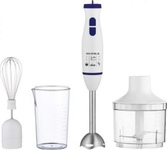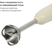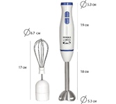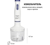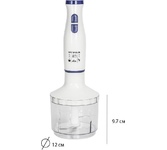 Максимальная мощность: 800вт; 3 в 1: насадка блендер, насадка-венчик, насадка-измельчитель; Корпус блендера из Высококачественный АБС-пластик; Количество скоростей: 1 режим скорост; Шнур электропитания: 1 м; Защита двигателя от перегрузки: термостат (автоотключение до полного остывания двигателя); Чаша для резки (500мл); Мерный стакан (700мл); Номинальное напряжение: 220 – 240в; Вес нетто/ брутто (кг) : 0,93 / 1,32 кг; Габариты упаковки (ШхГхВ): 390х145х270 мм