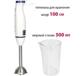 Параметры Максимальная мощность 1500 Вт Номинальная потребляемая мощность 600 Вт Объем чаши измельчителя 500 мл Объем мерного стакана 700 мл Описание Блендер электрический предназначен для смешивания, измельчения и взбивания продуктов и жидкостей в бытовых и аналогичных условиях Ножи из нержавеющей стали Три сменные насадки: насадка для смешивания венчик для взбивания измельчитель Мерный стакан Противоскользящие ножки чаши измельчителя Плавная регулировка скорости Режим «ТУРБО» Цвет: белый Упаковка: цветная коробка
