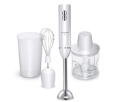 Ручной блендер 3 в 1: блендер/миксер/измельчитель, Мощность: 800 Вт, 2 скоростных режима, Тип управления Механический, Скорость работы в основном режиме 15000 об/мин., Насадки (блендер, венчик) из нержавеющей стали, Объем чаши измельчителя 500 мл, Мерный стакан 600 мл, Защита от перегрева/перегрузки, Параметры электропитания 220-240 В, 50-60 Гц