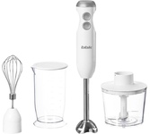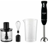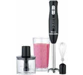Блендер * Мощность: 1500 Вт * Мерный стакан: 700 мл * Чаша измельчителя: 500 мл * Венчик для взбивания * Ножи из нержавеющей стали * Число скоростей: 2 * Удобная эргономичная прорезиненная ручка * Плавный регулятор мощности * Металлическая погружная часть * 220-240 В, 50\ Гц * Мощный мотор *