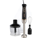 Блендер погружной, набор из 4-х предметов, мощность 1400 ватт, металлическая нога, 2 скорости, режим турбо, плавная регулировка переменной скорости, нож блендера из нержавеющей стали, насадка -венчик, мерный стакан-700 мл, измельчитель-500 мл