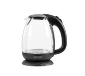 Чайник электрический, объем 1,7л, максимальная мощность 2200 Вт, волнистая форма корпуса, светодиодная подсветка, ручное открывание крышки, фильтр от накипи, защита от включения без воды, автоматическое отключение, индикация включения, индикатор уровня воды, подставка с возможностью вращения на 360 градусов, хранение электрошнура в подставке, материал корпуса: боросиликатное стекло