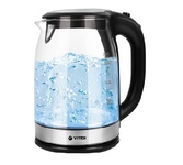 Корпус из термостойкого стекла. Объем 1,5 литра. Иллюминация. Ручка с покрытием от скольжения. Поворот на подставке на 360°. Быстрое закипание. Фильтр от накипи . Закрытый нагревательный элемент. Автоматическое отключение. Защита от перегрева без воды. Электрошнур в цокольной подставке, 65см. Номинальная мощность 1850-2200 Вт. 220-240 B ~ 50/60 Гц.