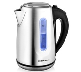 Максимальная мощность 2200 Вт. Максимальный объем 1,7 литра. Корпус из нержавеющей стали. Внутренняя подсветка. Индикатор уровня воды. Автоотключение при закипании воды. Отключение при отсутствии воды. Моющийся фильтр. Противоскользящее основание. Электропитание 220-240 В.,~50-60 Гц.