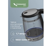 Стеклянный чайник «Триколор Дом» объемом 1,7 литра и мощностью 2 200 Вт станет незаменимым источником тепла и уюта в вашем доме. Мягкая голубая подсветка сообщит, что чайник работает, и создаст уютную атмосферу. Прозрачное термостойкое стекло сохранит естественный запах и вкус воды. До 12 000 циклов использования обеспечивает контактная группа STRIX® от мирового лидера в производстве контроллеров для чайников Вращение 360° позволит повернуть чайник так, чтобы пар не попадал на мебель и технику. Автоматическое отключение при закипании и отсутствии воды обеспечит безопасность и защиту от перегрева. Съемный фильтр для воды задержит частицы накипи, сохранив полезные качества воды. Кнопка автооткрытия крышки откроет крышку чайника одним нажатием. Провод можно спрятать в подставке, чтобы не мешал при использовании.
