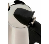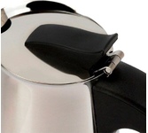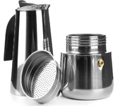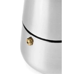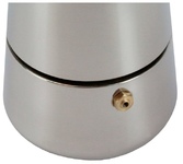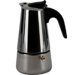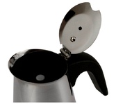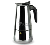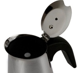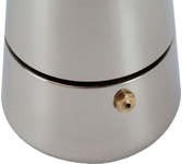 На 4 чашки. Нерж. сталь. Ручка и кнопка из нейлона (не нагреваются). Предохранительный клапан давления. Можно использ-ть на газ. плитах.Гейзер состоит из нижней емкости для воды, спец. сита-фильтра для кофе и верхнего чайничка для уже готового напитка.
