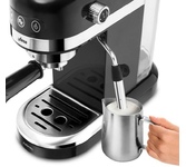 Давление 19 бар / Резервуар для воды 1.4 л / Резервуар для молока 0.39 л / Мощность 1450 Вт / Электронное управление / Корпус из нержавеющей стали / Автоматический капучинатор / Регулировка крепости кофе / Выбор объема порции кофе и молока / Индикатор необходимости очистки / Многоразовый фильтр и мерная ложка в комплекте / Съемный поддон для сбора жидкости / Откидная площадка для кружек малого объёма