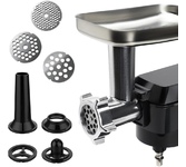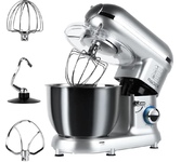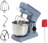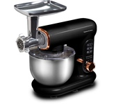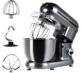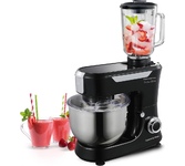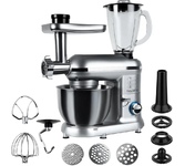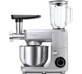 Многофункциональный кухонный комбайн мощностью 1500 Вт с 6 скоростями и импульсным режимом (от 70 до 220 об/мин) станет незаменимым помощником на кухне. Прибор работает от сети 220-240 В (50-60 Гц) и оснащен 4.5-литровой чашей из нержавеющей стали и 1.5-литровым стеклянным блендером, сочетая функции мясорубки, блендера, планетарного миксера и овощерезки (докупается отдельно). Прочный АБС-пластиковый корпус в железно-сером цвете дополнен LED-индикатором работы и удобным рычагом для подъема рабочей головки. Особенности включают плавную регулировку скорости, импульсный режим, ножки-присоски для устойчивости и простую смену насадок. В комплекте: металлическая чаша, защитная крышка, крюк для теста, плоский битер, венчик для взбивания, блендер, мясорубка (с насадками для колбасок и кеббе), руководство пользователя. Устройство упаковано в подарочную и транспортировочную коробки, а уровень шума менее 75 дБ делает работу комфортной.