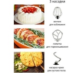 Мощность 500Вт. 5 скоростей. Турборежим. 2 насадки. Венчик для взбивания. Крюки для замешивания теста.