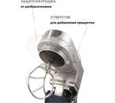 Миксер планетарный, объем чаши из нержавеющей стали 5,2 л, мощность 1200 Вт, 6 скоростей, импульсный режим, светодиодный индикатор включения, защитная прозрачная крышка от брызг, защита двигателя от перегрева, противоскользящие ножки