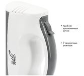 Мощность макс. 200 Вт 7 скоростных режимов 2 венчика для взбивания яиц и крема, смешивания жидкостей 2 насадки для размешивания теста Кнопка для быстрого и легкого извлечения насадок