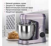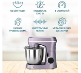 Мощность 1300 Вт Планетарное вращение Количество скоростей 8 Объем чаши 4.5 л Импульсный режим Материал корпуса пластик Цвет лавандовый Количество насадок в комплекте 3 шт Прорезиненные ножки Срок гарантии 12 мес.