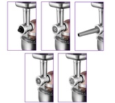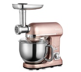 Мощность 1000 Вт. Ёмкость чаши 5 л. Материал чаши нержавеющая сталь. Производительность мясорубки 1,4 кг/мин. Длина шнура 1,2 м. Материал корпуса нержавеющая сталь. Количество скоростей 6 + импульсный режим. Количество насадок 12. Размер прибора 348 х 272 х 345 мм.