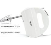 Миксер ручной, мощность 400 Вт, 5 скоростных режимов, режим ТУРБО, скорость вращения до 1400 об/мин, 2 венчика для взбивания, 2 крюка для замешивания теста, кнопка извлечения насадок,легкий и удобный в использовании, длина сетевого шнура 1.1 м, электропитание 220-240 В, 50/60 Гц