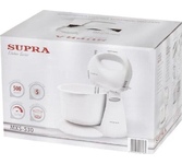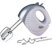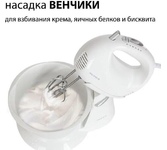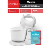 Мощность 500Вт. 5 скоростей. Режим Турбо. Насадки: 2 насадки для взбивания яиц и крема; 2 насадки для замеса тяжелого теста. Материал корпуса пластик.