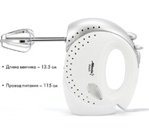 Миксер, Мощность 500 Вт, 5 скоростных режимов, Режим ТУРБО, 2 венчика для взбивания, 2 крюка для замешивания теста, Скорость вращения до 1400 об/мин, Защита от перегрузки, Насадки из нержавеющей стали , Кнопка извлечения насадок, Эргономичный дизайн, Длина сетевого шнура: 1 м, Напряжение 220-240 В, 50-60 Гц