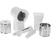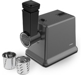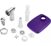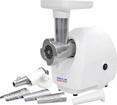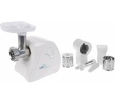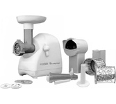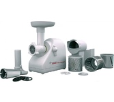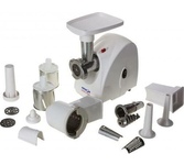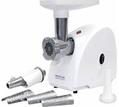 3 в 1: мясорубка / овощерезка / шнековая соковыжималка, Прорезиненные ножки, 2 диска с отверстиями 5 и 7 мм, Крупная терка, Мелкая терка, Насадка для кеббе, Насадка для колбас, Слайсер, Толкатель, Шнековая соковыжималка
