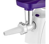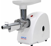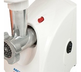 Максимальная мощность 1500 Вт, номинальная мощность 230 Вт, производительность — до 100 кг/час. Функция РЕВЕРС. Комплектуется приставкой — соковыжималкой.; набивки колбасных изделий. Предназначена для получения соков с мякотью из мягких овощей, фруктов, ягод; Защита двигателя от перегрузки; 3 вида решеток для получения фарша разной консистенции - с диаметром отверстий 4,9 мм и 7 мм, а также овальными отверстиями; Удобное хранение ножей и решеток; Высокое размещение шнековой камеры; Функция «реверс» для предотвращения наматывания жилок на шнек; Устойчивые нескользящие ножки для фиксации мясорубки на поверхности стола;