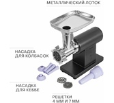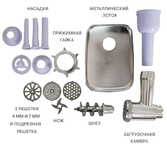 Мясорубка Максимальная мощность – 2700 Вт; Номинальная мощность – 800 Вт; Напряжение – 220-240 В, 50-60 Гц; Производительность – 2,7 кг/мин; Шнековый блок увеличенного диаметра – 60 мм; 3 режущих диска с отверстиями – 3/5/8 мм; Функция реверс – есть; Дисплей - есть; Соединение шнека с двигателем – металлическое;