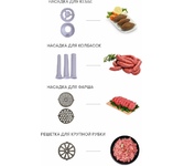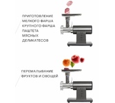 Мясорубка. Высокая производительность: до 3,5 кг фарша в минуту. Сверх прочный корпус из литого алюминия. Стальная система крепления. Удобное управление кнопками. Управление кнопками. DMP + Двойная защита двигателя (от перегрева, от перегрузки). Функция реверса. Высококачественный нож с 3мя дисками из нержавеющей стали: 3 мм, 5 мм, 7 мм, + система очистки ножей. 3 насадки для приготовления колбас разных диаметров и насадка для приготовления кебаба. Технология Silence Balance (менее 72 дБ). Овощерезка с 3мя барабанами (Крупная, Мелкая, Шинковка). Мощный мотор 2 500 Вт.