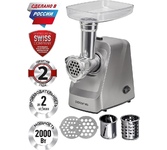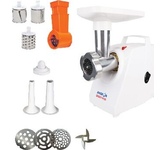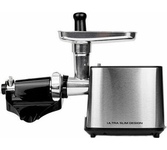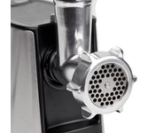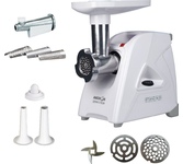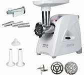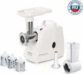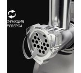 Максимальная мощность 1500 Вт, номинальная мощность 230 Вт, производительность — 1,7 кг/мин Защита двигателя от перегрузки; 3 вида решеток для получения фарша разной консистенции - с диаметром отверстий 4,9 мм и 7 мм, а также овальными отверстиями; Удобное хранение ножей и решеток; Высокое размещение шнековой камеры; Функция «реверс» для предотвращения наматывания жилок на шнек; Устойчивые нескользящие ножки для фиксации мясорубки на поверхности стола;