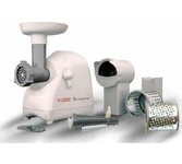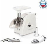 Мощность 1700Вт. Производит-ть 120 кг/час. Приставка-соковыжималка д/цитрусовых. 3 решетки с отверстиями разл. размера. Функция реверс. Особая конструкция шнековой с винтовой канавкой. Прочный и острый нож.