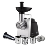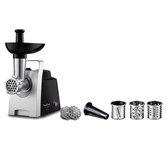 Тип управления механический Цвет черный Номинальная мощность 300 Вт Максимальная мощность 1340 Вт Напряжение 220-240 В, 50 Гц Материал корпуса пластик Материал лотка пластик Материал ножа нержавеющая сталь Защита от поражения электрическим током класс II Производительность 1,5 кг/мин Скорость вращения шнека 240 об/мин Защита от перегрузки есть Функция реверса есть Защита от поражения электрическим током класс II Защита от перегрева есть Количество терок 4 Количество перфорированных дисков для фарша 2 Длина шнура электропитания 0,8 м Габаритные размеры 435х290х135 мм Вес нетто 2,2 кг Комплектация Моторный блок, блок мясорубки, лоток, шнек мясорубки, нож мясорубки, перфорированные диски для фарша (2 шт.), фиксирующее кольцо, толкатель мясорубки, насадка для кеббе, насадка для колбасок, блок овощерезки, толкатель овощерезки, шинковка,мелкая терка, крупная терка, терка для драников, руководство по эксплуатации, сервисная книжка