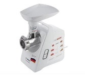 Номинальная потребляемая мощность 300 Вт. Материал корпуса пластик. Панель управления механическая. Длина провода 1,5 м. Материал ножей нержавеющая сталь. Производительность 4 кг/мин. Мощность 2000 Вт. Цвет белый. Производительность — до 3 кг фарша в минуту. Двойная защита от перегрузки. Функция «реверс» для предотвращения наматывания жилок на шнек. Отсек в корпусе для шнура питания, хранения ножа и насадок. Особая заточка ножа и решетки увеличенной толщины из нержавеющей стали, обеспечивающие высокое качество фарша из всех видов мяса и других продуктов. До 30 минут непрерывной работы. 2 вида решеток для получения фарша разной консистенции - с диаметром отверстий 4,9 мм и 8,5 мм. Высокое размещение шнековой камеры. Эргономичная гайка для удобной сборки/разборки мясорубки. Ручка для переноски. Устойчивые нескользящие ножки для фиксации мясорубки на поверхности стола. Возможность вертикального хранения для экономии пространства на кухне.