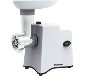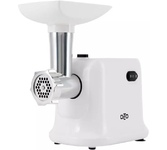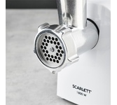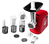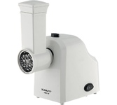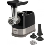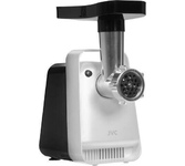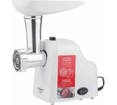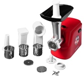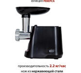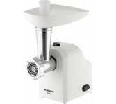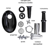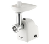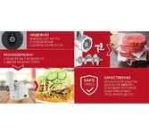 Мощность 1800 Вт, функция РЕВЕРС, 3 решетки с отверстиями разного диаметра (3/5/7 мм), решетки и нож из высококач. нерж. стали, удобный толкатель, насадка для приготовления домашней колбасы, насадки "КеББЕ", материал корпуса пластик, материал лотка - пластик.