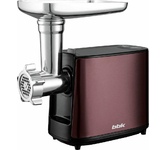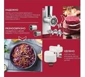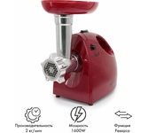 Мощность 1800 Вт. Прочный метал. шнек. Функция РЕВЕРС. 2 решетки для измельчения и рубки. Решетки и нож из высококач. нерж. стали. Удобный толкатель. Насадка для приготовления домашней колбасы. Насадки «КУББЕ». Материал корпуса металл.