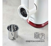 Тип: С овощерезками. Мощность, Вт: 1800. Производительность кг/мин: 2. Функция реверс: Да. Перфорированные диски для мяса, размер отверстий мм: 5 и 7. Защита двигателя от перегрузки: Да. Нож из нержавеющей стали: Да. Насадка кеббе: Да. Насадка для приготовления домашних сосисок: Да. Насадки для терки и шинковки овощей, шт.: 2. Материал лотка для подачи мяса: Пластик. Резиновые ножки для повышенной устойчивости: Да. Количество решеток: 2. Особенности модели: Отсек для хранения диска. Цвет: Белый с красным.