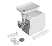 Мясорубка, максимальная мощность: 2500Вт, функция реверс, нож из нержавеющей стали, 2 решетки в комплекте: 5мм, 7мм, пластиковый лоток, прорезиненные ножки, производительность (макс): 2,7 кг/мин, насадки для приготовления колбасок и кеббе, механический фиксатор блока мясорубки, цвет: белый