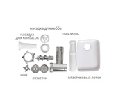 2 в 1: мясорубка и овощерезка, Прорезиненные ножки, 2 диска с отверстиями 5 и 7 мм, Крупная терка, Мелкая терка, Насадка для кеббе, Насадка для колбас, Слайсер, Толкатель