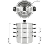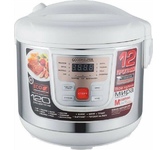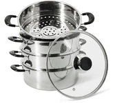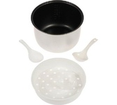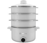 800Вт, многофункциональная электрическая пароварка (готовит на пару, тушит, жарит, варит, стерилизует), регулируемая мощность 400Вт /800Вт, 3 паровые корзины из нержавеющей стали, общий объем 8л, чаша с антипригарным покрытием 1,2л, двухслойный корпус: металл + пластик, диаметр внутренний 22,5см, внешний – 23см, высота 1 корзины: 6.5 см, глубина чаши: 9 см, крышка из закаленного стекла с паровыводящим отверстием, механическое управление, защита от перегрева, цвет корпуса: белый молочный. Длина шнура: 0,8 м. Размеры прибора: 37*29,5см