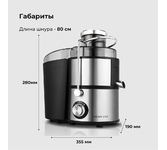 Центробежная соковыжималка Максимальная мощность 800 Вт 2 скорости для мягких и твердых продуктов Широкий желоб для целого плода 65 мм Корпус из нержавеющей стали Фильтр из нержавеющей стали Контейнер для мякоти объемом 1,2 л Контейнер для сока объемом 0,35 л Противокапельная система Прорезиненные ножки Электропитание 220-240 В, ~ 50-60 Гц