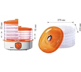 (ШхГхВ) 30,5х30,5х39,5см.5 поддонов для овощей и фруктов.Форма корпуса цилиндрическая.Диаметр поддона для овощей и фруктов 305мм.Полезный объем 15л.Мощность нагревательного элемента 500Вт.Мощность вентилятора 16Вт.Регулировка температуры 30-70С (в нижнем поддоне).Степень защиты от доступа воды IP20.Вес 3,1кг.