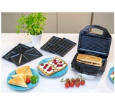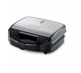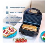 Мощность 900 Вт; антипригарное покрытие на 4 сендвича; возможность работы в вертикальном состоянии; 3 набора съёмных пластинЖ для сэндвичей, для вафлей, для гриля