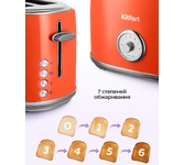 Мощность 1050 Вт - быстрый нагрев и поджаривание тостов 7 степеней обжарки - под любые вкусовые пристрастия пользователей Функция подогрева - подогрев уже готовых тостов, всегда горячий и румяный хлеб Функция разморозки - для разморозки и обжаривания замороженного хлеба Поддон для крошек