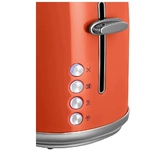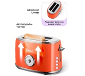 Тостер мощность 970 Вт, 2 слота для тостов, 7 степеней обжаривания, функции: подогрев, размораживание. Автоматическое центрование тостов, регулировка степени обжаривания, в комплекте: лоток для крошек, решетка для подогревания булочек. Цвет: белый/красный