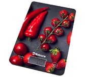 Электронные, нагрузка 8 кг, цена деления 1 г, ЖК дисплей, учет веса тары, автомат.отключение, индикатор перегрузки и заряда батарейки, питание 1*CR2032 , пластиковый корпус, рабочая поверхность из прочного стекла, рисунок: перцы.
