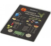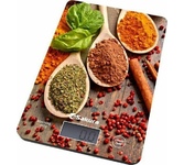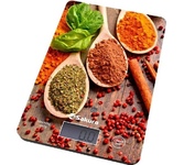 Электронные, нагрузка 8 кг, цена деления 1 г, ЖК дисплей, учет веса тары, автомат.отключение, индикатор перегрузки и заряда батарейки, питание 1*CR2032 , пластиковый корпус, рабочая поверхность из прочного стекла, рисунок: специи/темн.дерево.