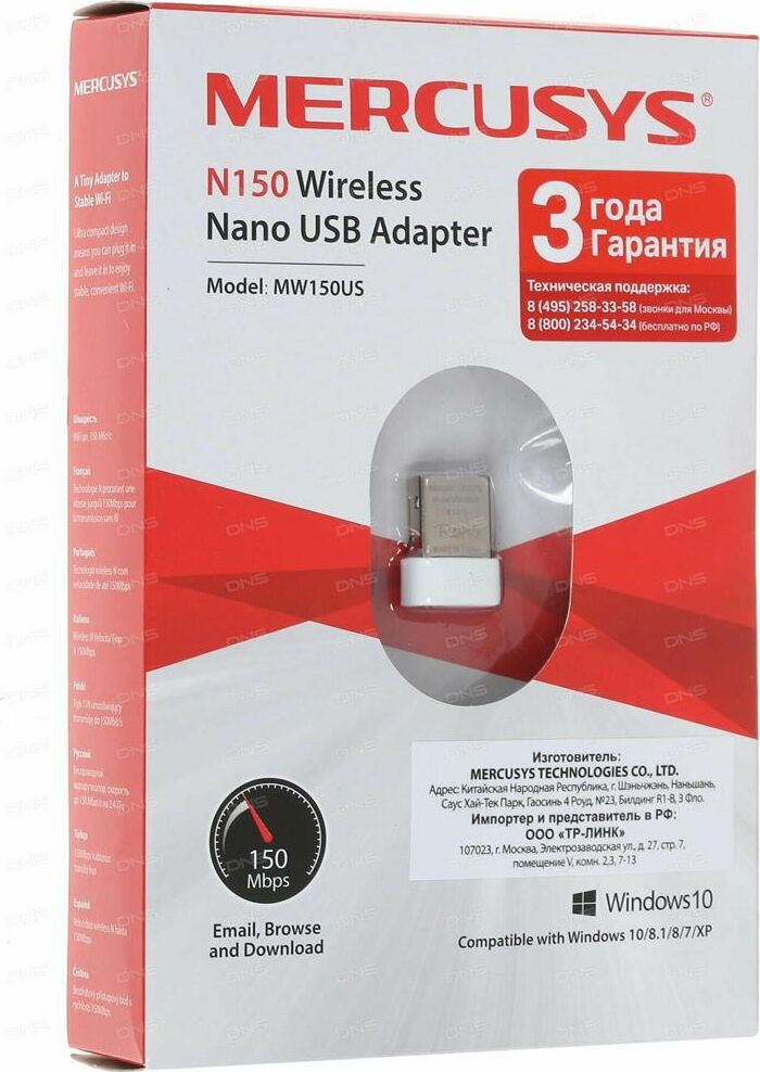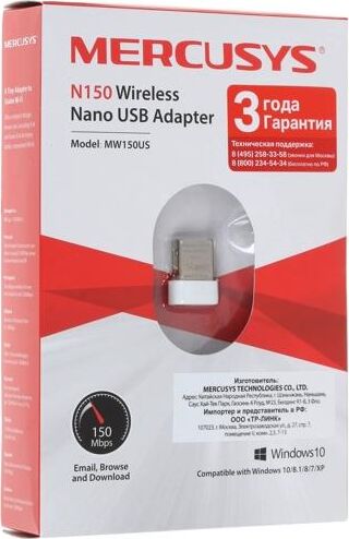 Wi-Fi адаптер, стандарт Wi-Fi: 802.11n, максимальная скорость 150 Мбит/с, подключение через USB 2.0. Идеальное решение для онлайн-игр, потокового HD-видео, просмотра веб-страниц, отправки email и чатов