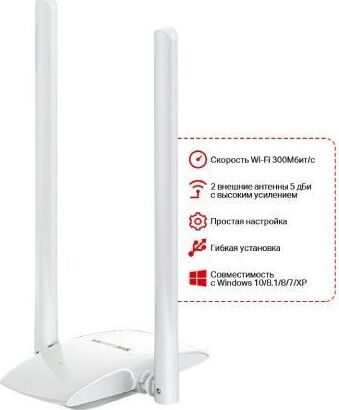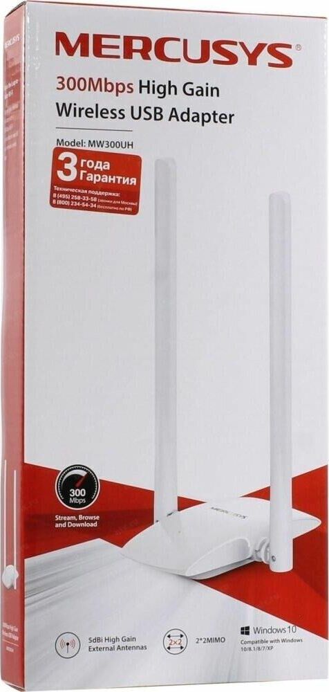 Адаптер высокого усиления, две 5 дБи высокочувствительные антенны, гибкая установка с USB кабелем, поддержка Windows 10/8.1/8/7/XP(32/64 bit). интерфейс: USB 2.0; диапазоны Wi-Fi: 2.4ГГц. Современный сетевой адаптер WiFi от торговой марки Mercusys модель MW300UH представляет собой компактное устройство. Он предназначен для подключения к компьютеру или ноутбуку через USB-порт, чтобы обеспечить подключение скоростного интернета. Он прекрасно подойдет для загрузки файлов в большом объеме, а также станет идеальным решением дляонлайн-игрили загрузки HD-видео. Поддерживает различные стандарты Wi-Fi и совместим со всеми версиями Windows.