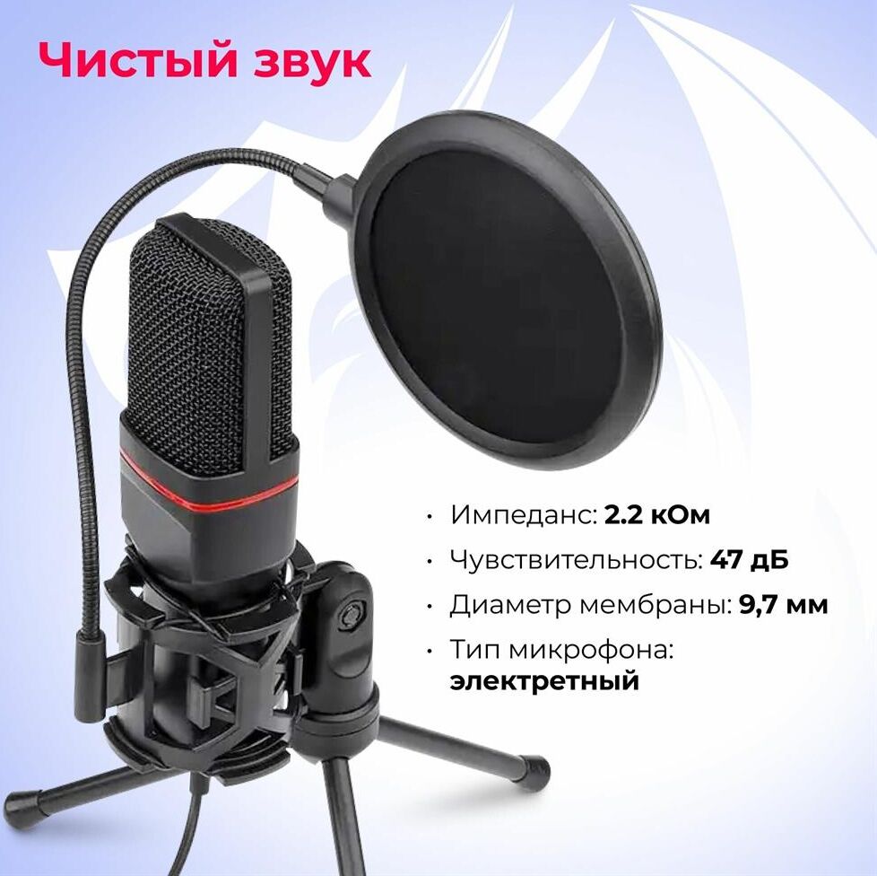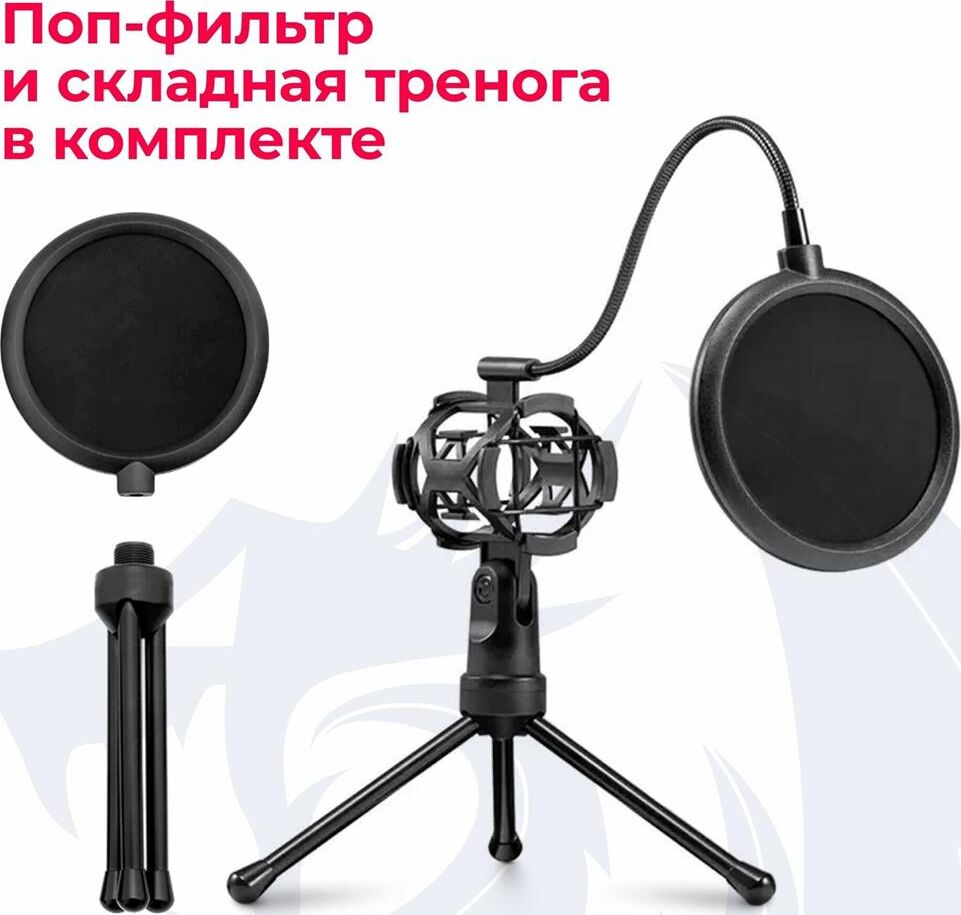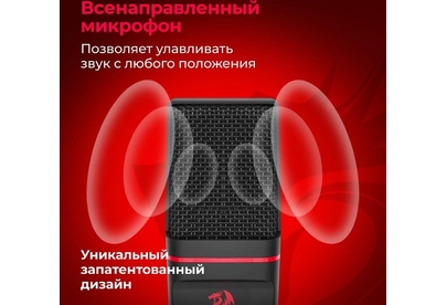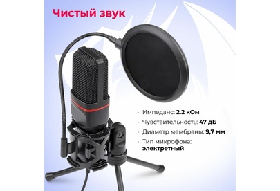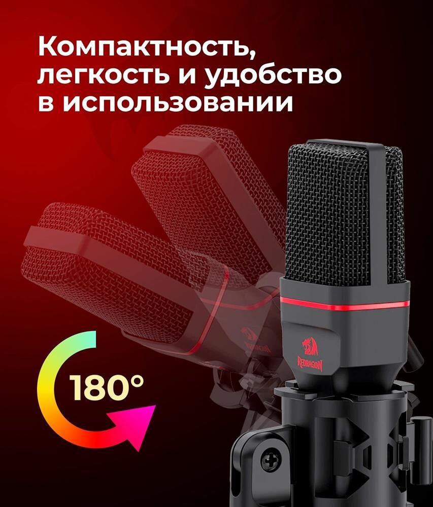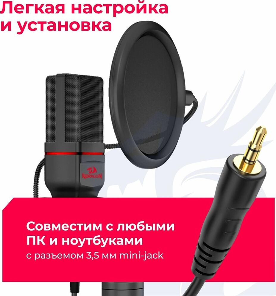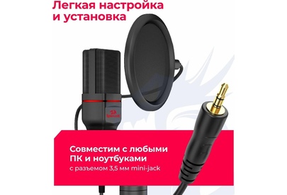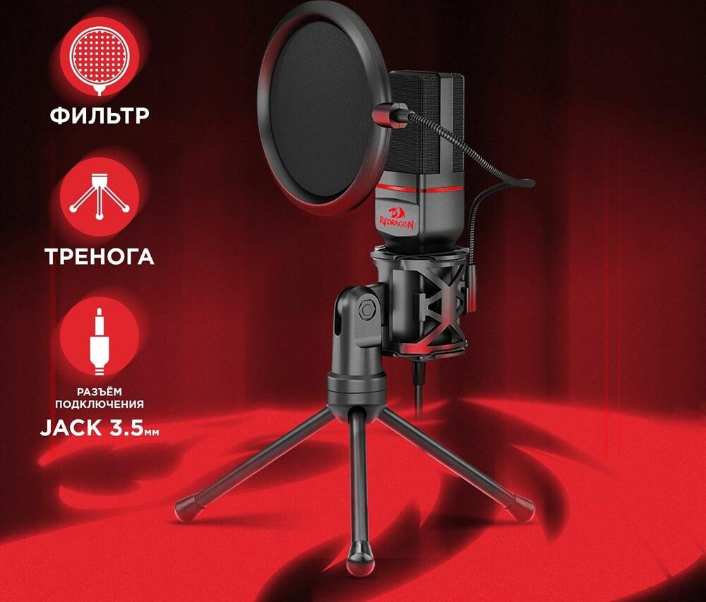 Игровой стрим микрофон Redragon Seyfert GM100 3.5 мм, кабель 1.5 м: Мощный микрофон в комплекте с треногой и поп-фильтром идеально подойдет для стримов и записи видео на YouTube, Twitch и других платформах. Легкая компактная конструкция, простое подключение. Совместим с любыми ПК и ноутбуками с разъемом 3,5 мм. Складная тренога и поп-фильтр в комплекте. Всенаправленный микрофон позволяет улавливать звук с любого положения. Легкая настройка и установка. Компактность, легкость и удобство в использовании.