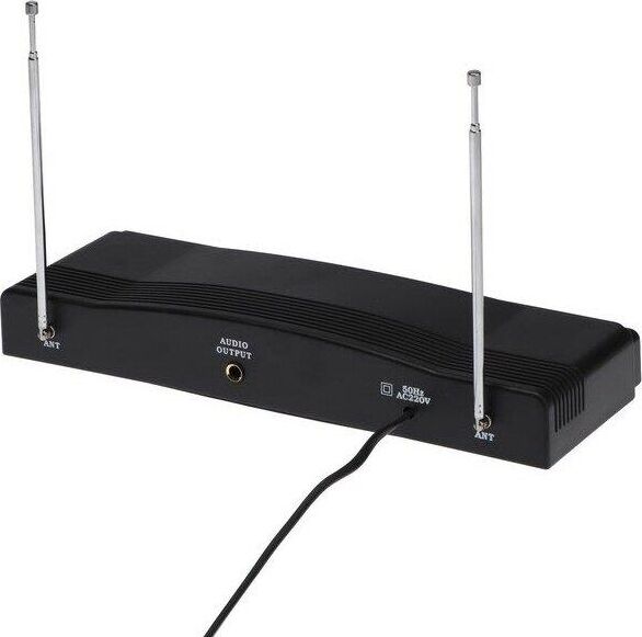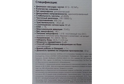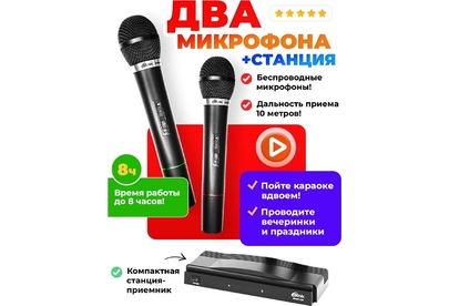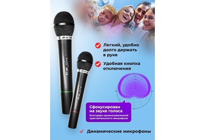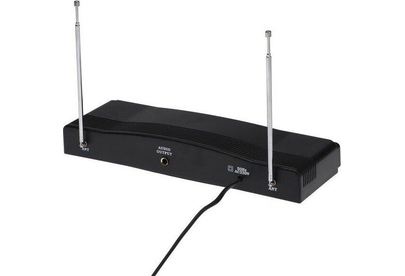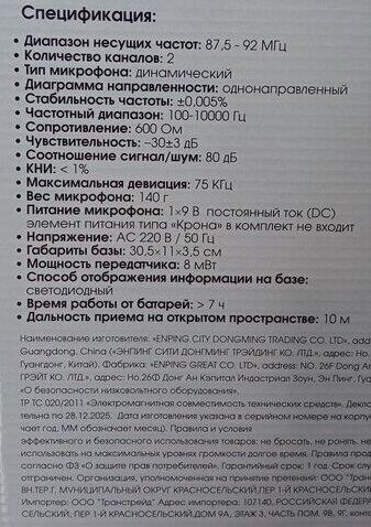 Беспроводная микрофонная система VHF-диапазона с двумя микрофонами в комплекте, мощность радиопередатчика - 8 мВт, диапазон частот радиосоединения 87,5—92 МГц, количество каналов в диапазоне 2, тип микрофона - динамический, воспринимаемый диапазон -частот 100–10000 Гц, чувствительность микрофона -30±3 дБ, импеданс микрофона - 600 Ом, индикация заряда, размеры - 305 х 110 х 35 мм.